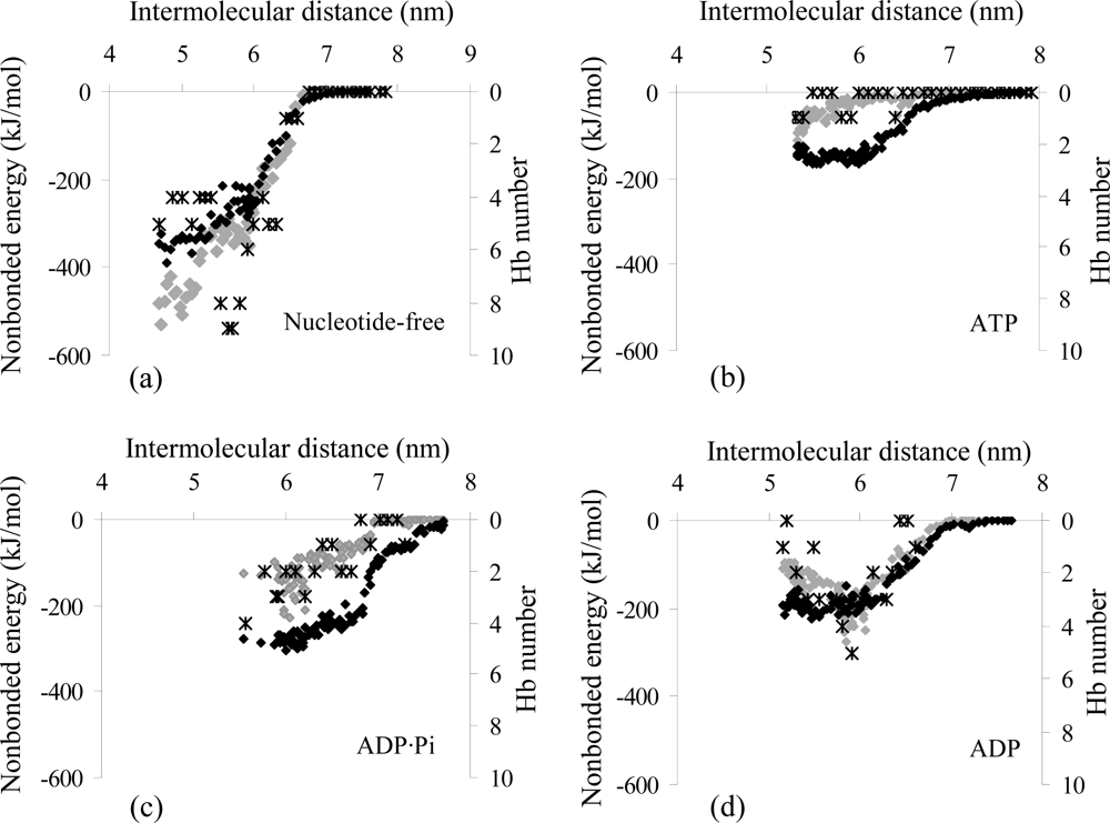 Profiles of Coulomb energy term (grey dots), van der Waals energy term (black dots) and Hb number connecting the actomyosin complex (crosses) as a function of intermolecular distance, in different nucleotide-dependent conformations. nucleotide-free (a), ATP (b), ADP·Pi (c), ADP (d).