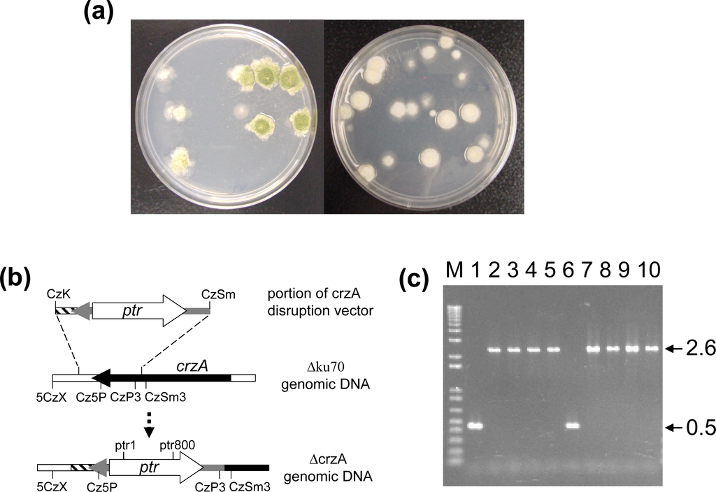 Characterization of crzA disruptants. (a) Colony morphology of crzA disruptants on regeneration plates. (b) Schematic representation of the expected genomic pattern of a Δ crzA mutant after double-crossover recombination. (c) Genomic patterns of parental strains and ΔcrzA mutants revealed by PCR using primers Cz5P and CzP3. M: DNA 1kb ladder. Lane 1, BN9Δku70; lanes 2–5, BN9ΔcrzA; lane 6, RHΔku70; lanes 7–10, RHΔcrzA.