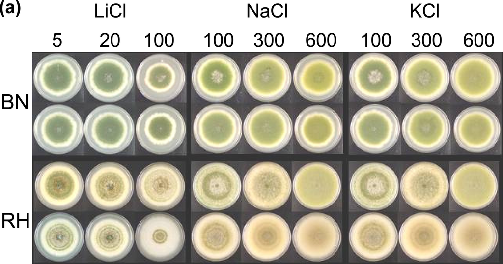 The A. parasiticus strains are sensitive to many metal ions (Figure 2). In the dark at increasing concentrations, addition of lithium, sodium, or potassium to the medium did not affect conidiation of the BN9ΔcrzA mutants, but it decreased conidiation and sclerotial formation of the RHΔcrzA mutants (Figure 2a). Compared to respective parental strains, adding calcium decreased vegetative growth and asexual development of the ΔcrzA mutants regardless of illumination conditions (Figure 2b).
