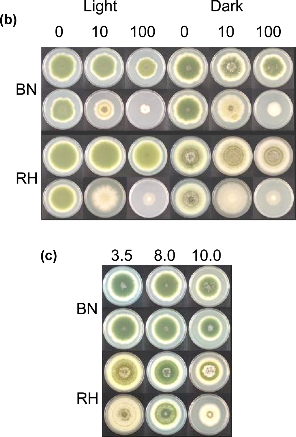 An aliquot of spore suspension was seeded at the center of each PDA plate (100 × 15 mm). BN9Δku70, RHΔku70, and three ΔcrzA mutants derived from each parental strain were evaluated. Determination of each colony diameter in duplicate plates was performed after growth at 30°C for a week under light and in the dark.