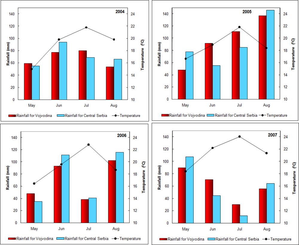 Monthly amounts of rainfall for the territories of Vojvodina and central Serbia and the mean monthly air temperatures in the same period for the territory of Serbia.