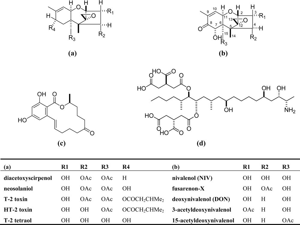 | deoxynivalenol (DON) | C15H20O6 | emesis and feed refusal in swine, IgA nephropathy in mice, alter humoral immunity in mice, inhibition of RNA and DNA synthesis in human cell lines, activation of MAPK in human cell lines, activation of cytokines in murine and human cells, LD50 in ddS strain of male mice dosed IP was 70 mg/kg; females, 76.7 mg/kg, IC50 for the inhibition of DNA synthesis was 1.50 mM in mouse 3T3 cells, LD50 values for DON were estimated to be 78 mg/kg (oral) and 49 mg/kg (i.p.) in the B6C3F1 mouse | Major mycotoxin in scabby cereals | [4, 12–21] |
