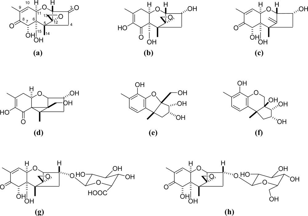 | de-epoxy DON (c) | C15H20O5 | IC50 for inhibition of DNA synthesis was 83.0 mM in mouse 3T3 cells | found in milk and serum in cows fed DON contaminated feed | [20, 62, 63] |