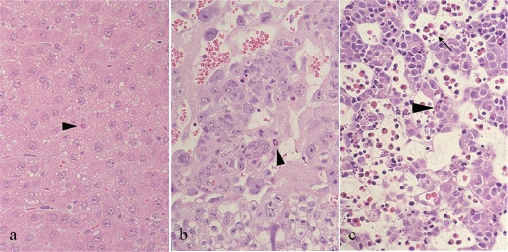 Histopathology of maternal liver (a), placenta (b) and fetal liver (c) obtained from pregnant rats at 6 hr after treatment with T-2 toxin (2 mg/kg) on day 13 of gestation. An arrowhead indicates apoptotic hepatocyte (a and c) and cytotrophoblast (b), and an arrow indicates apoptotic hematopoietic cell (c). Apoptotic cells show pyknotic or karyorrhectic nucleus and condensed eosinophilic cytoplasm. Hematoxylin and eosin stain, × 100 (original magnification).