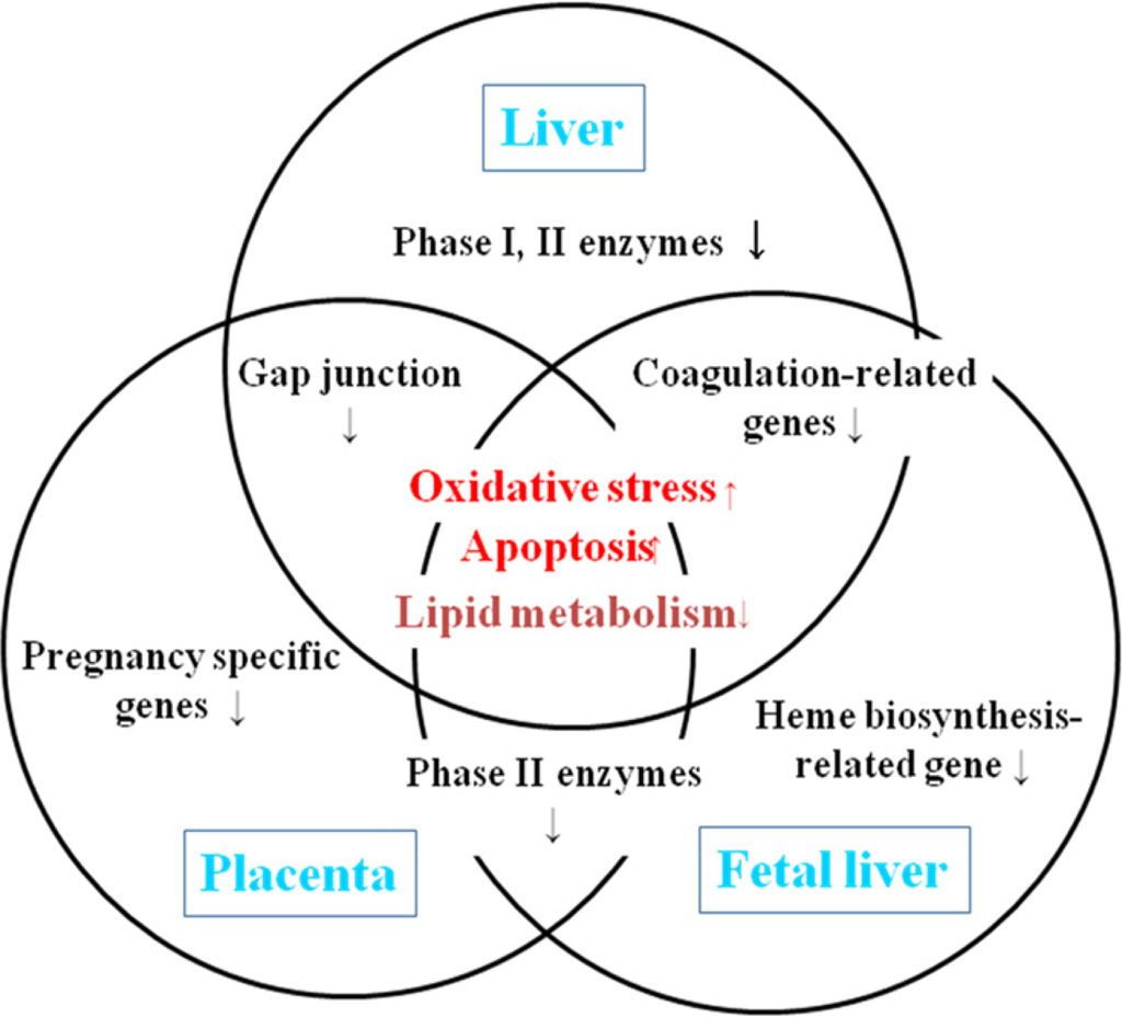 The number of metabolism-related genes in the placenta is smaller than those in the maternal liver and fetal liver, suggesting that the placenta might play a less role in T-2 toxin metabolism. In addition, the differences in the expression of cytochrome P-450 genes between the maternal liver and fetal liver might reflect the difference in the basic expression of cytochrome P-450 genes between the maternal liver and fetal liver.