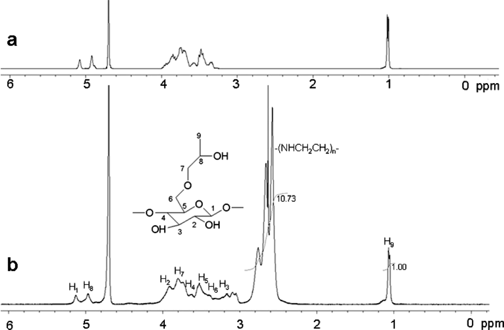 1H-NMR spectra of (a) HP α-CD, (b) HP α-CD-PEI.