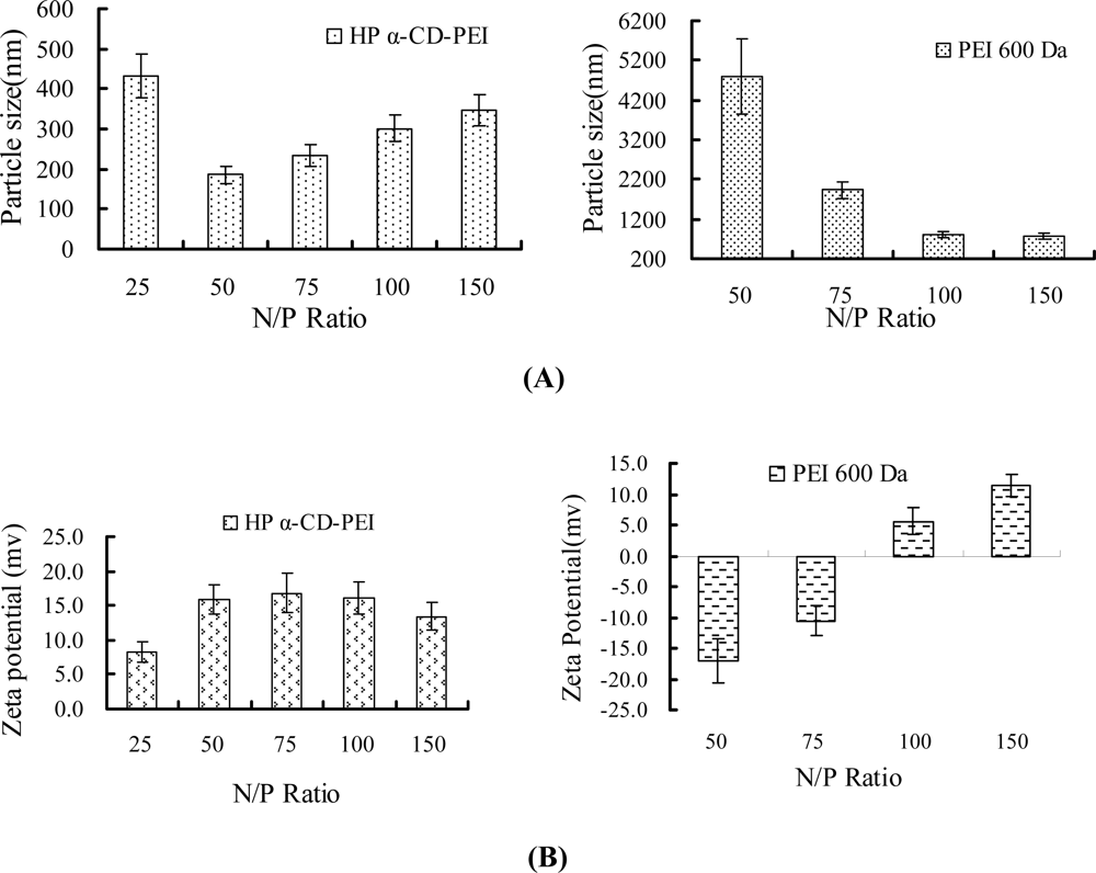 (A) Particle size (B) Zeta potential of HP α-CD-PEI/DNA and PEI 600 Da/DNA complexes.