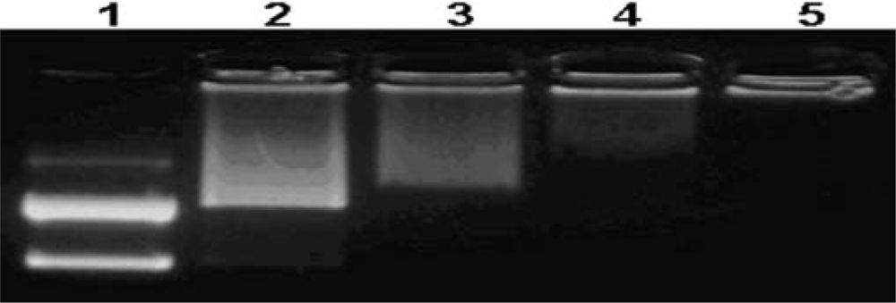Agarose gel electrophoresis retardation of pGL3 plasmid DNA by HP α-CD-PEI. Lane numbers correspond to HP α-CD-PEI/DNA at different N/P ratios: (1) 0:1 (DNA only), (2) 1:1, (3) 2:1, (4) 4:1, (5) 6:1.