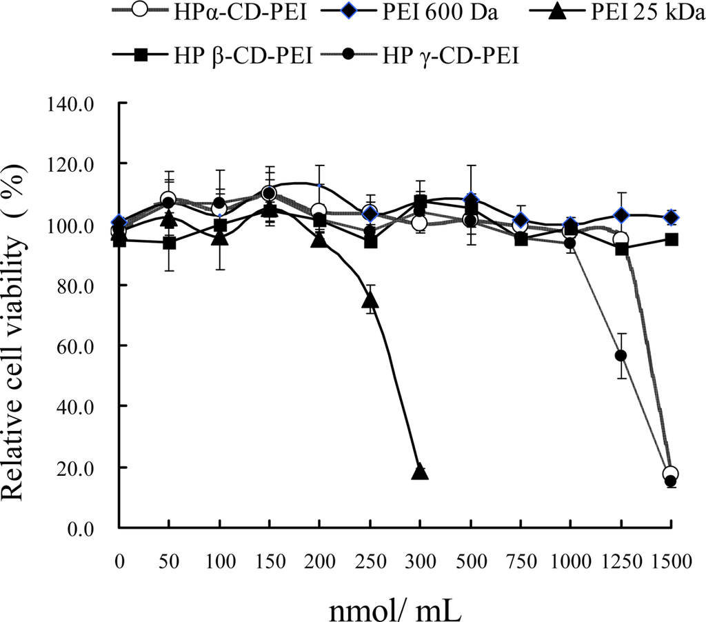 Figure 4 shows the cell viability assay results for different co-polymer/DNA complexes in SK-BR-3 cells. For HP-α-CD-PEI, when the concentration was up to 1,250 nmol/mL, the cell viability was about 94.7 ± 2.4%. For PEI 25 kDa, cell viability was only 18.6 ± 0.7% when the concentration was 300 nmol/mL. For HP γ-CD-PEI group, cell viability was about 15.3 ± 1.9% when the concentration was 1,500 nmol/mL. For HP β-CD-PEI group and PEI 600, they maintained low toxicity at all concentrations. The results indicated that HP α-CD-PEI and HP γ-CD-PEI have low cytotoxicity and HP β-CD-PEI has no cytotoxicity in SK-BR-3 cells.