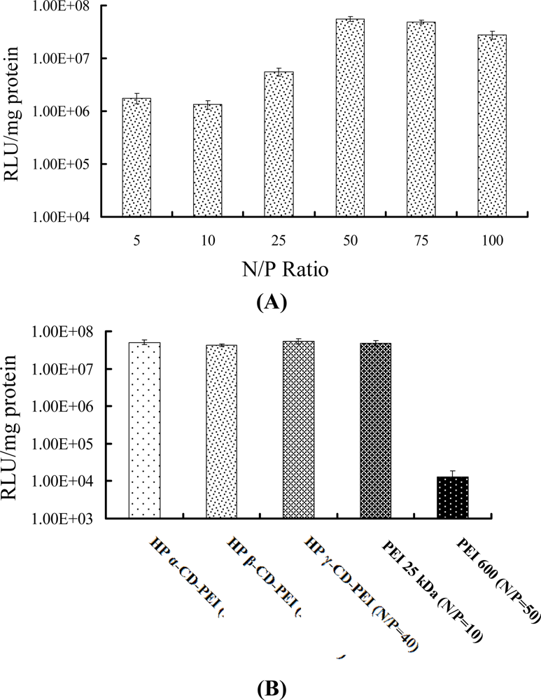 Luciferase assay of co-polymer/DNA complexes in SK-BR-3 cells. (A) HP α-CD-PEI/DNA complexes at different N/P ratios, (B) HP α-CD-PEI/DNA complexes (N/P ratio is 50), HP β-CD-PEI/DNA complexes (N/P ratio is 300), HP γ-CD-PEI/DNA complexes (N/P ratio is 40) and PEI 25 kDa/DNA complexes (N/P ratio is 10).