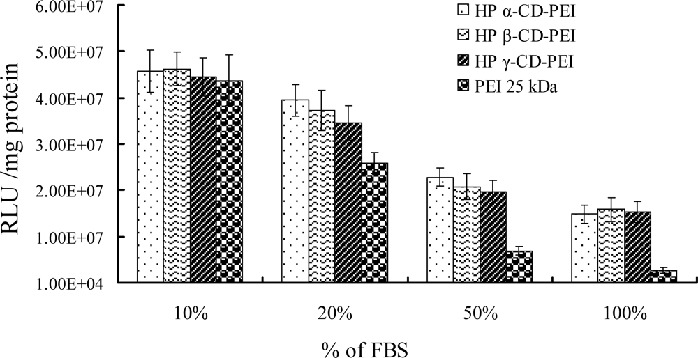 Figure 6 shows the results of transfection efficiency of co-polymers in different FBS (Fetal Bovine Serum) concentrations of culture mediums. The serial concentrations were 10%, 20%, 50% and 100%, respectively. In 10% FBS medium the RLU reading of HP α-CD-PEI was 4.7 × 107, or 1.05-fold higher than PEI 25 kDa (4.4 × 107), Increased the concentration of FBS, from 20% to 100%, they were 1.5, 3.3 and 5.5 times higher than PEI 25 kDa, respectively.