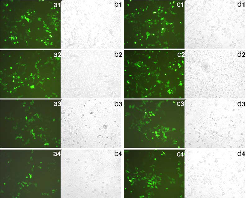 Fluorescent and bright field images of enhanced green fluorescent protein expression in SK-BR-3 cells transfected with of PEI 25 kDa carrying pEGFP at N/P ratio of 10 in different FBS concentration medium (a1, in 10% FBS; a2, in 20% FBS; a3, in 50% FBS; a4, in 100% FBS), HP α-CD-PEI carrying EGFP plasmid at N/P ratio of 50 (c1, in 10% FBS; c2, in 20% FBS; c3, in 50% FBS; c4, in 100% FBS). Image of column a1 to a4 and c1 to c4 were in fluorescence, image of column b1 to b4 and d1 to d4 were in bright field.