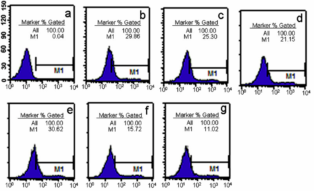 Figure 8 shows the results of flow cytometric analysis using HP α-CD-PEI/DNA and PEI 25 kDa/DNA complexes in SK-BR-3 cells. The images indicate that the ratio of green fluorescence positive cells using HP α-CD-PEI/DNA complexes (Figure 8c) was 1.61-fold higher than that of PEI 25k Da/DNA complexes (Figure 8f) in 50% FBS medium, it (Figure 8d) was 1.91-fold higher than PEI 25 kDa/DNA complexes (Figure 8g) in 100% FBS medium, it (Figure 8b) was close to PEI 25 kDa/DNA complexes (Figure 8e) in 10% FBS medium.