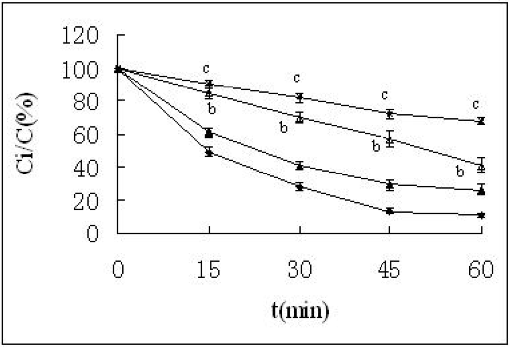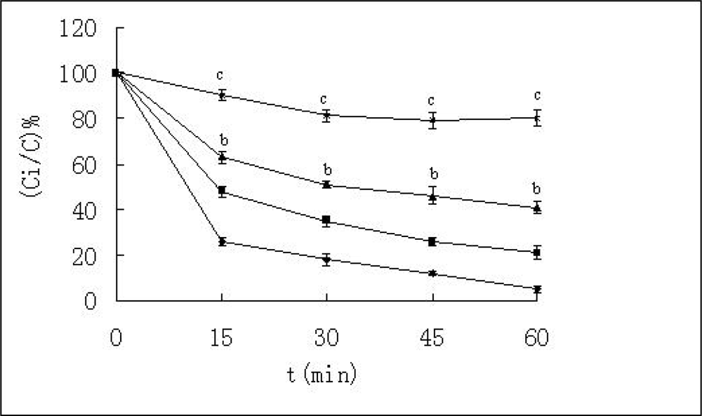α-Chymotrypsin is a common protease in the intestine, so degradation of insulin by α-chymotrypsin was investigated in vitro. The remaining insulin was measured by HPLC (Figure 1) and PAGE (Figure 2). The results using both detection methods were consistent. As shown in Figures 1 and 2, insulin was degraded rapidly by α-chymotrypsin, and most of insulin was degraded after 60 min. In order to examine whether HP-β-CD and casein could protect insulin from degradation or not, HP-β-CD and casein was examined, respectively.