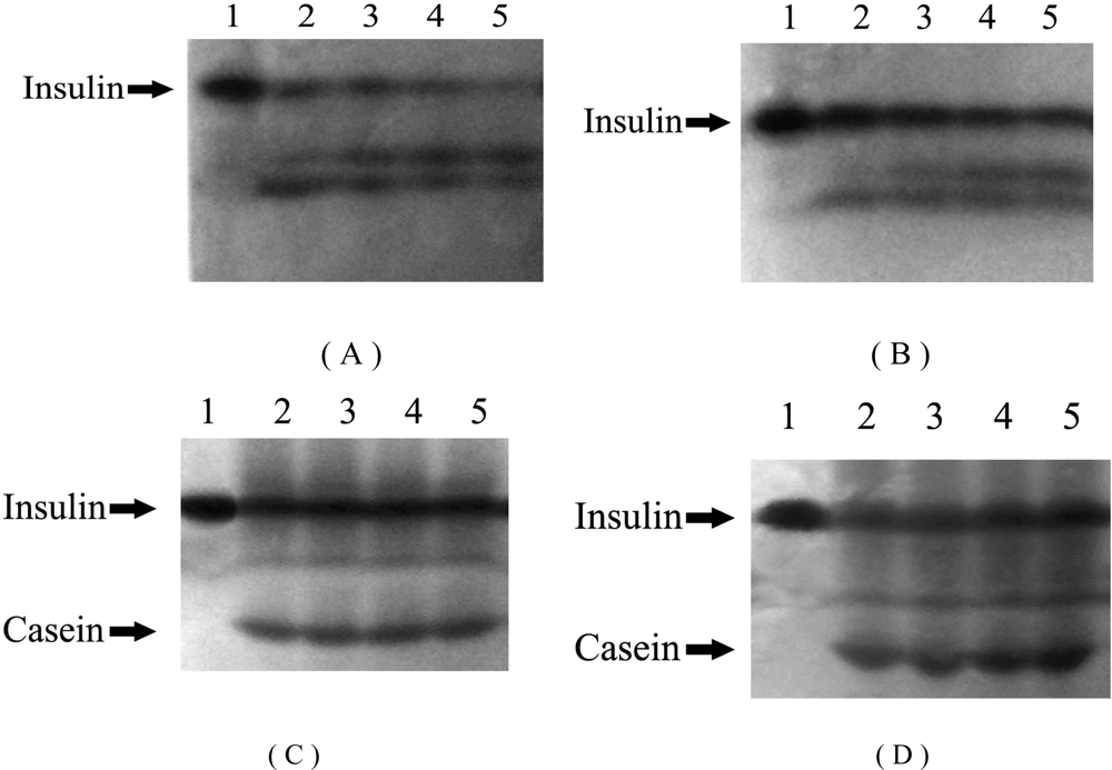 Effects of HP-β-CD and casein on degradation of insulin induced by α-chymotrypsin. Lanes 1-5 in (A) represent insulin incubated with α-chymotrypsin at 37 ºC for 0, 15, 30, 45 and 60 min, respectively; Lanes 1-5 in (B) represent insulin incubated with α-chymotrypsin and HP-β-CD at 37ºC for 0, 15, 30, 45 and 60 min, respectively; Lanes 1-5 in (C) represent insulin incubated with α-chymotrypsin and casein at 37 ºC for 0, 15, 30, 45 and 60 min, respectively; Lanes 1-5 in (D) represent insulin incubated with α-chymotrypsin, HP-β-CD and casein at 37 ºC for 0, 15, 30, 45, 60 min, respectively.