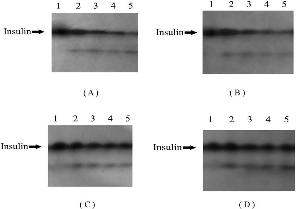 Effects of HP-β-CD and protamine on degradation of insulin induced by trypsin. Lanes 1-5 in (A) represent insulin incubated with trypsin at 37 ºC for 0, 15, 30, 45 and 60 min, respectively; Lanes 1-5 in (B) represent insulin incubated with trypsin and HP-β-CD at 37 ºC for 0, 15, 30, 45 and 60 min, respectively; Lanes 1-5 in (C) represent insulin incubated with trypsin and protamine at 37 ºC for 0, 15, 30, 45 and 60 min, respectively; Lanes 1-5 in (D) represent insulin incubated with trypsin, HP-β-CD and protamine at 37 ºC for 0, 15, 30, 45 and 60 min, respectively.