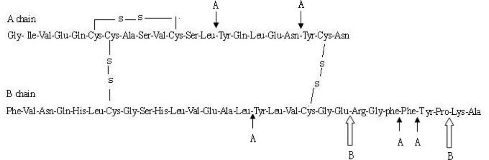 The cleavage site of insulin by proteases. A: The sites are the recognized site of α- chymotrypsin; B : The sites are the recognized sites of trypsin.