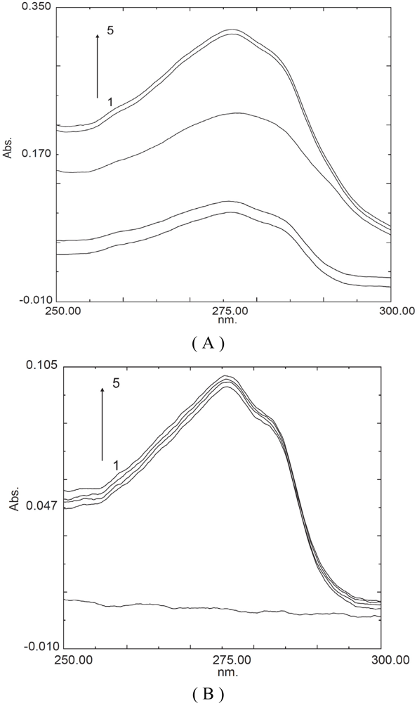 UV absorption spectra of insulin in different solutions. Curves 1-5 in (A) represent insulin, Insulin (100 μg/mL) + HP-β-CD (1 mg/mL), Casein (200 μg/mL), Insulin (100 μg/mL) + Casein (200 μg/mL), Insulin (100 μg/mL)+ Casein (200 μg/mL) + HP-β-CD (1 mg/mL), respectively; Curves 1-5 in (B) represent protamine (200 μg/mL), insulin (100 μg/mL), insulin (100 μg/mL) + protamine (200 μg/mL), insulin (100 μg/mL) + protamine (200 μg/mL) + HP-β-CD (1 mg/mL), insulin (100 μg/mL) + HP-β-CD (1 mg/mL), respectively.