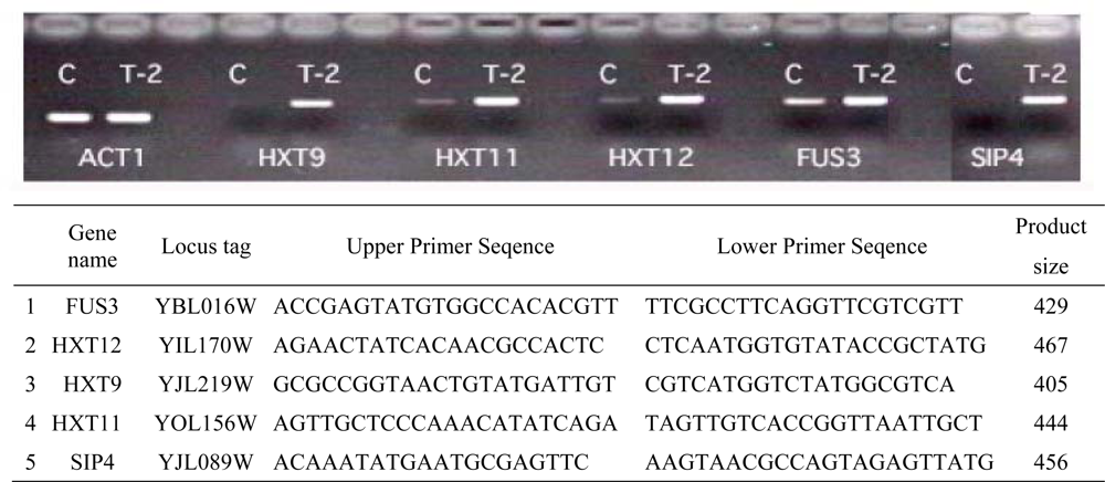 DNA microarray can be used to understand chemotoxicity and the selection of reporter genes indicative of such toxicity. The genes highly induced by T-2 toxin treatment are candidate reporter genes. To confirm the possibility of using these genes as reporters, we selected Hxt9, Hxt11, Hxt12, Fus3 and Sip4 (Figure 5). All genes yielded more RT-PCR product compared to the control.