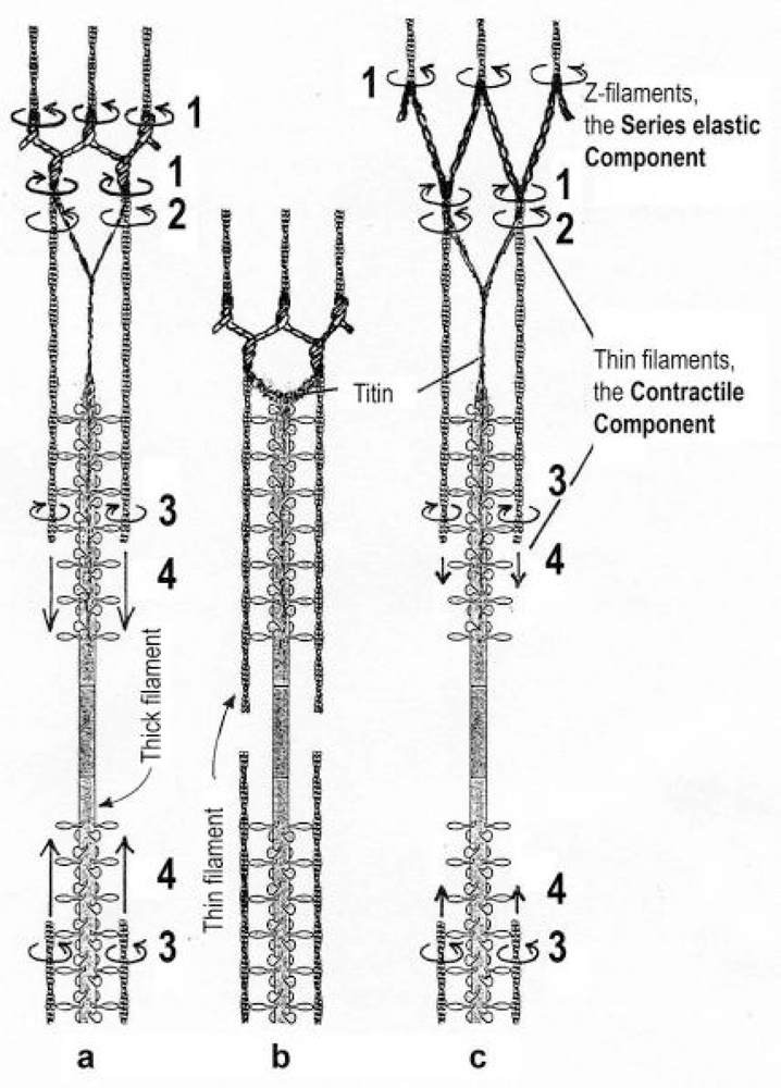 As described, the helical thin filaments (the “contractile component”) transform the axially directed motion of stretch to rotation. The strong torque of stretch stored in the Z-filaments is so used during release for clockwise drilling rotation of sarcomere shortening. Also without stretch, after stimulation by Ca-activation, the helical thin filaments transform their tropomyosin generated torque into the axially directed drilling rotation of shortening. Myosin S1 chains may strengthen the drilling motion by winding up and unwinding with ATP-splitting.