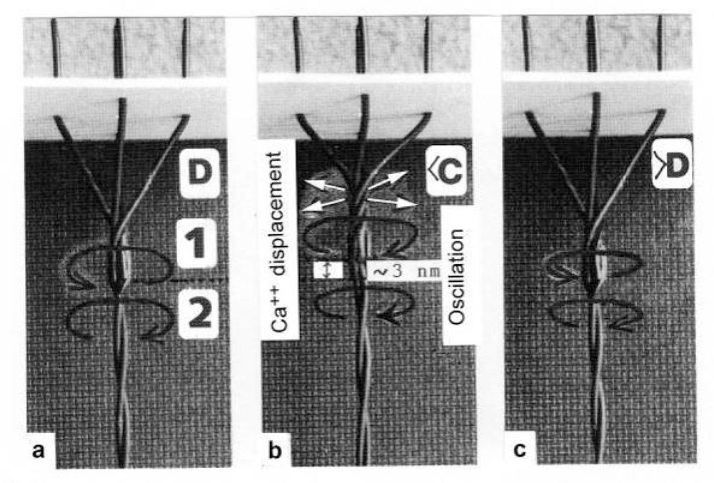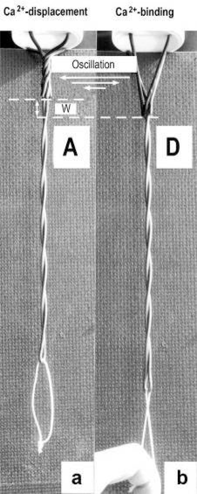 A rigid wire-helix model with Z-filaments in the A stage (a) is strongly stretched to the D stage (b). This means for the α-actinin Z-filaments of muscle that Ca2+ is bound by the liberated sites during stretch in (b), and displaced as “extra Ca2+” when again relaxed in (a). Since Ca2+ binding produces more torque in the Z-filaments, feedback-regulated damped oscillations of the Z-filaments can appear (arrows).