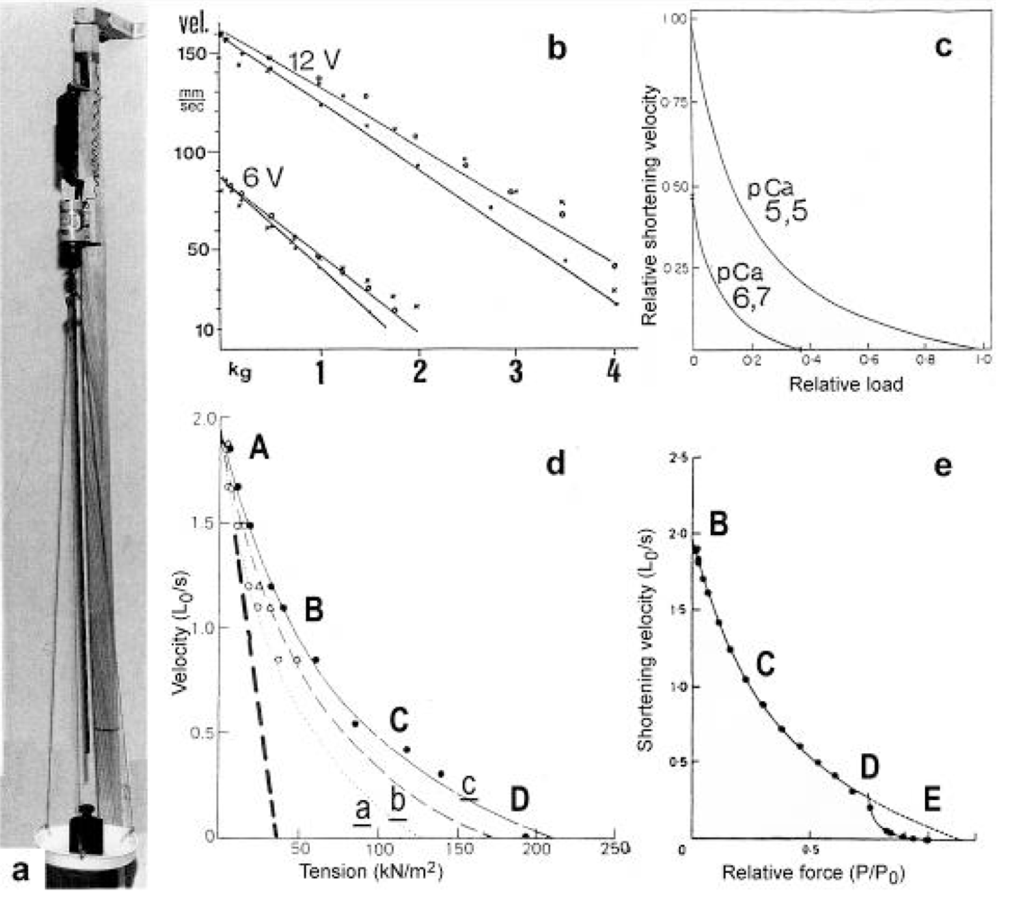 The force-velocity relation.(a) A long electromotor-driven rotating screw-coil (well lubricated) lifts its nut with a plate for weights. (b) Its force-velocity relations are straight lines that depend on the electromotoric force 6V or 12V, as shown (from Jarosch []). (c) The force-velocity relations of muscle are hyperbolae that depend on the Ca2+ concentration (from Julian et al. []; with permission). (d) The curvature of the curves indicated with a, b and c increases with time at the beginning of an isometric tetanus (curve a: 0.32 P0, 75 ms after the first stimulation, curve b: 0.50 P0 after 100 ms, curve c: l.00 P0, after 190 ms). The steady force for a given velocity increases with time (from Cecchi et al. []; with permission). The force-velocity of muscle would be linear (as the curves in (b), or the added dashed line in (d), or the velocity curves in Figure 23), when only the load would increase, but the torsional force would remain constant. Since also the torsional driving force increases from Z-filament twisting stage A to D, as indicated, the relation is a hyperbola. (e) Deviation of the force-velocity curve from an exact hyperbola in the high force region (from Edman et al. []; with permission). Here, all twisting stages may be shifted so, that stage D is already reached by a slow drilling velocity.