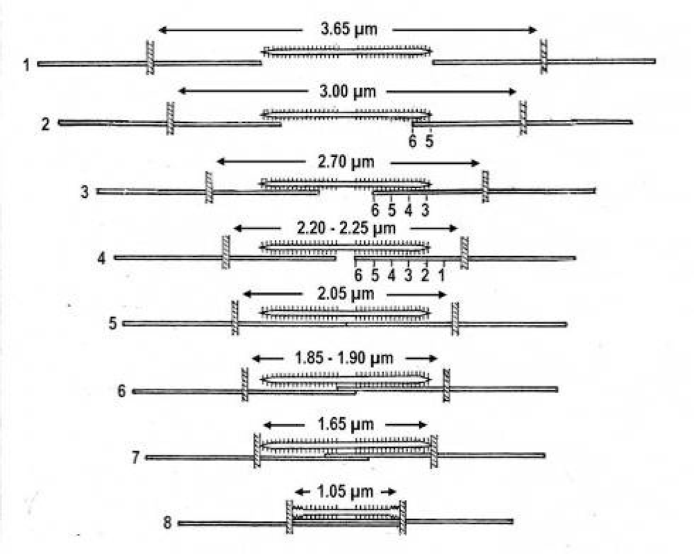 The dependence of some components of latency-relaxation was described by Sandow []. The amplitude (depth) of it increases from 4% at 32 mm muscle length to 100% at 40 mm muscle length. The elongation should be highest from stage G of the Z-filaments and should decrease from F or E to D. Latency L1, the time from the stimulation to onset of positive tension means the untwisting time from stage G to D. It also increases with muscle length from 3.1 ms to 3.8 ms. However, latency LR, the time from the stimulation to the onset of relaxation decreases with muscle length from 1.7 ms to 1.2 ms. This may depend on the quicker rise of torque in the shorter cross-arms of stage G or F than in the longer cross-arms of stage E or D (compare the length of the cross-arms in Figure 5).