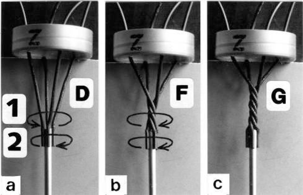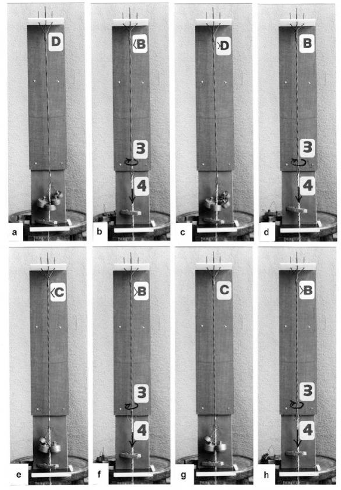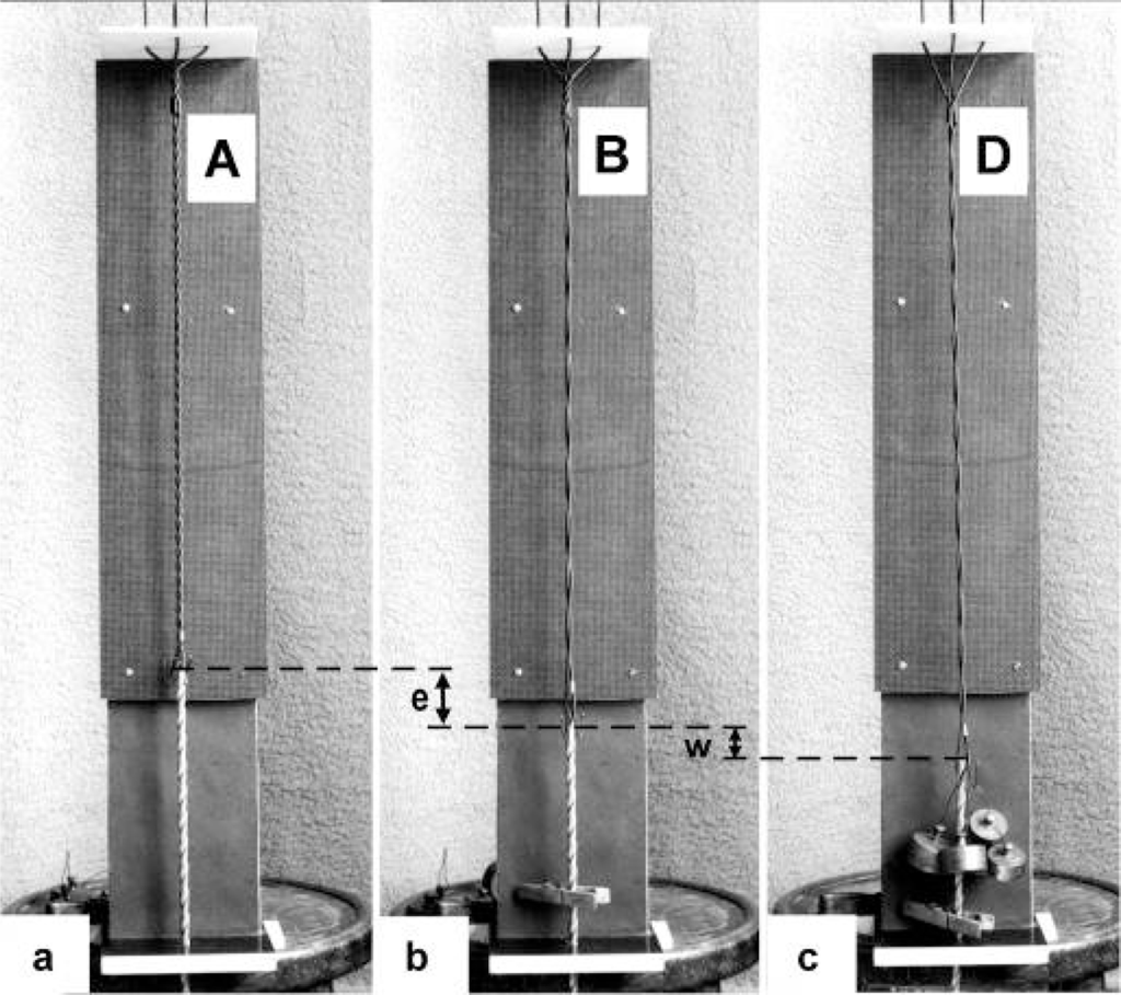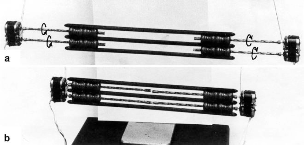 In order to study the mechanics of length changes more in detail, another model (Figure 14) was used. It contains the “contractile” and “series elastic component” combined as a unity. The “contractile component” is represented by a double helix containing of two intertwined rubber cords. The model is fully relaxed in Figure 14a, twisted by the torque for 16 rotations in Figure 14b, and twisted and loaded by 400 g in Figure 14c. The torque for the 16 rotations of the free end is equilibrated by the torque for about 1 rotation of the Z-filaments.