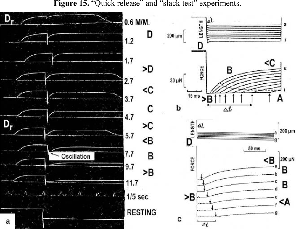The thin filaments contain a great reservoir of torque. But torque is lost by each active thin filament rotation (arrows 3 and 2 in Figure 1). This results in force “depression” or “force-deficit”. The redeveloped force after a large release does not more reach the original level. Extreme “force depression” is obtained by the extensive release in a “slack test” (see the lower tension curves of Figure 15a and the curves of skinned fibers in Figure 15b).