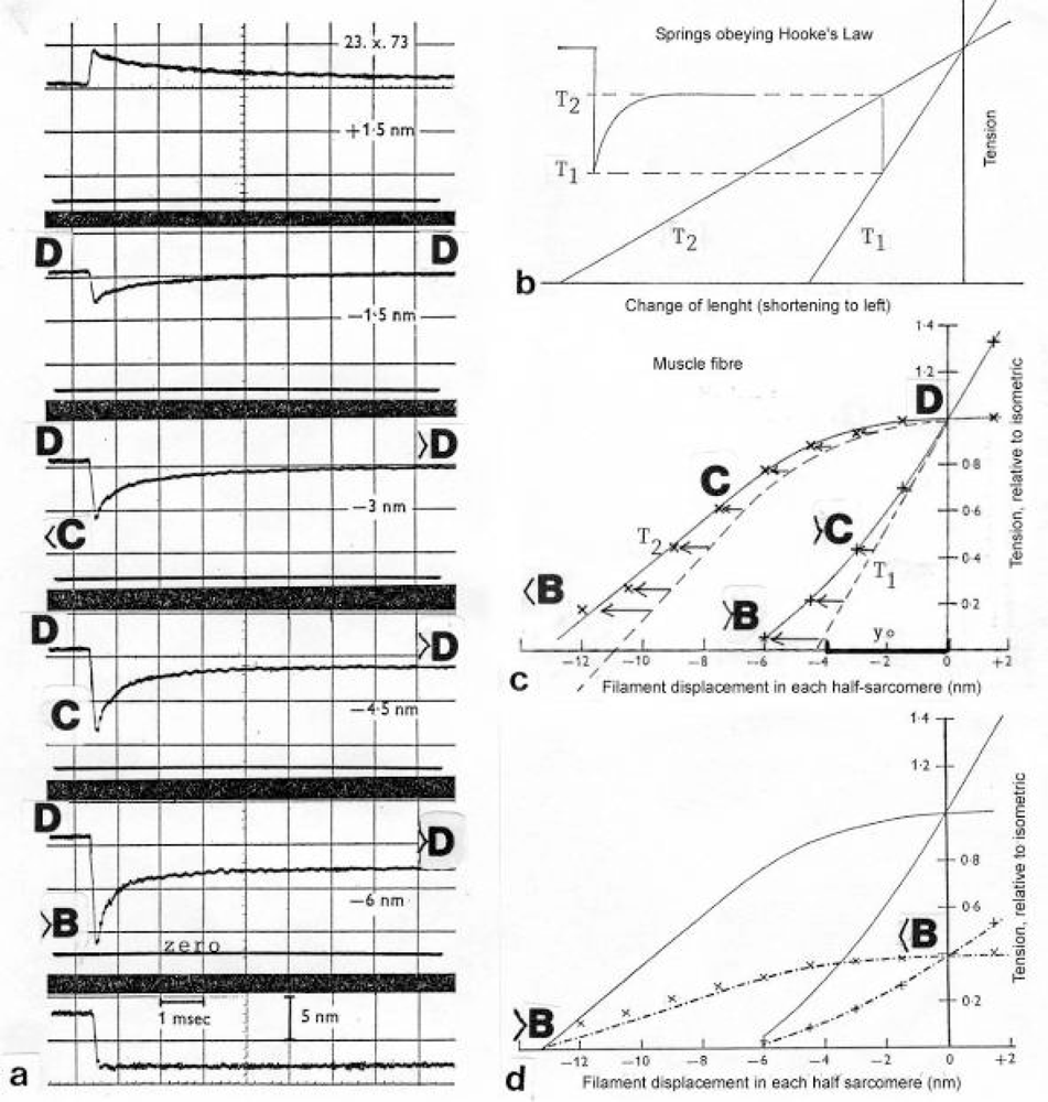 Quick length changes of small amplitudes on isolated frog muscle fibres during tetanic stimulation (all figures from A. Huxley []; with permission).(a) Tension curve of a quick stretch 1.5 nm (top panel) and quick releases of 1.5 nm, 3 nm, 4.5 nm and 6 nm. The length change, shown in the bottom panel, is complete in 0.2 ms []. (b) Tension transient response in an ideal Voigt element, i.e. spring in series with parallel combination of spring and dashpot. T1 extreme tension reached, T2 tension approached asymptotically. Both T1 and T2 give straight lines when plotted against the size of the imposed step change of length. (c) T1 and T2 curves constructed from a family of records as shown in (a) (sarcomere length 2.3 μm). Approximate changes of the Z-filament stages are added and some possible displacement by drilling is indicated by arrows. (d) The fibre with the T1 and T2 plots (crosses) shown in (c) stretched to sarcomere length 3.l μm, i.e. the overlap is reduced to approx. 39 %. The tension curves (crosses) scaled down by the factor 0.39 (from Huxley and Simmons []).