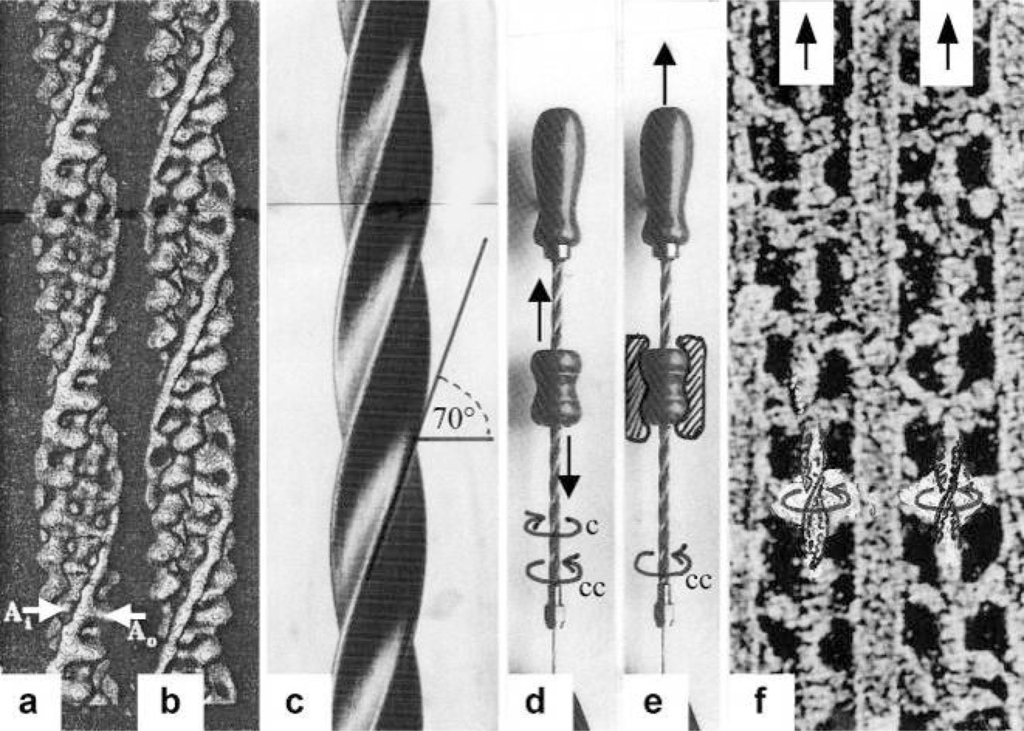 The model of Figure 3, from [], shows the function of the “contractile component”. It simulates sarcomere shortening by about three electromotor-driven clockwise drilling rotations (arrows) of drill-borer helices. But this model cannot explain muscle force because it lacks the series elastic Z-filaments that accumulate torque and tensile stress (see the next chapters).