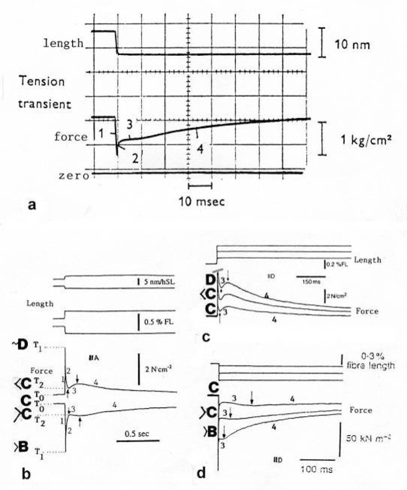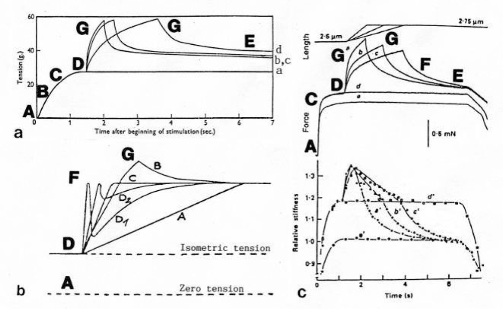 “The isometric response of muscle as ordinarily recorded, depends on the shortening of its contractile elements against the rising tension of its elastic elements, and that is a slow process. An applied stretch obviates the necessity of shortening and allows the change of stage resulting from stimulation to be examined directly” [, p. 320; , p. 70].