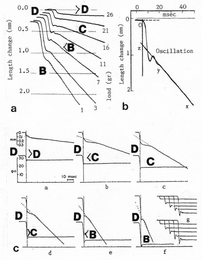 “Quick displacement” and isotonic steady state shortening after sudden load (force) decrease of a tetanized frog muscle. The approximative Z-filament stages are indicated.(a) The difference between quick displacement of the “series elastic component” and the steady state shortening of the “contractile component” is striking. The length change (left, in mm) and the remaining after-load (g) is indicated near each curve. (b) Damped oscillations superimpose the beginning of steady state shortening ((a) and (b), improved from Jewell and Wilkie []). (c) Similar experiments with own (lower) curves for the remaining afterload. At right in the lower panel, the tension curves of a spring which was fixed instead of the muscle (from Podolsky [], with permission).