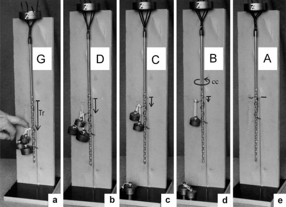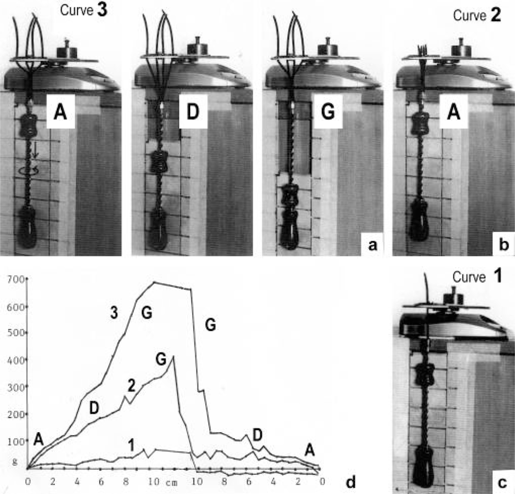 Drill-borer models demonstrate the force produced by the Z-filaments during unwinding and winding up from stage A to G and back to A. The disk with the Z-filaments and drill-borer was fastened on a digital balance and the force (g) produced by stepwise shifting down the drill-borer handle was measured. The curves in (d) show that the strongest pull is produced when a larger distance separates the single Z-filaments. The square distance was 30 mm in (a) (curve 3 in (d)), and 7 mm in (b) (curve 2). Twisting a single Z-filament, shown in (c), produced weak pull only (curve 1).