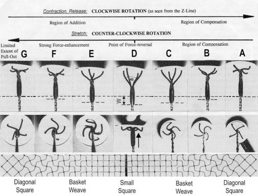 All twisting stages of the Z-filaments from A to G are shown in side view (upper panel) and axial view (middle panel). Only stage D is here shown in side view also in order to demonstrate that the swastica look with bent cross-arms results by shifting the helix to the Z-disk (arrow in stage D). “Region of Addition” and “Region of Compensation” indicate where the winding distance W (shown in D) increases or decreases the amount of sliding. The Z-filament patterns “small square”, “basket weave” and “diagonal square” appear in the electron microscope when seen in axial direction. These patterns are drawn in the lowest panel according to Yamaguchi et al. ([], with permission). For more details see text. Improved from Jarosch [].