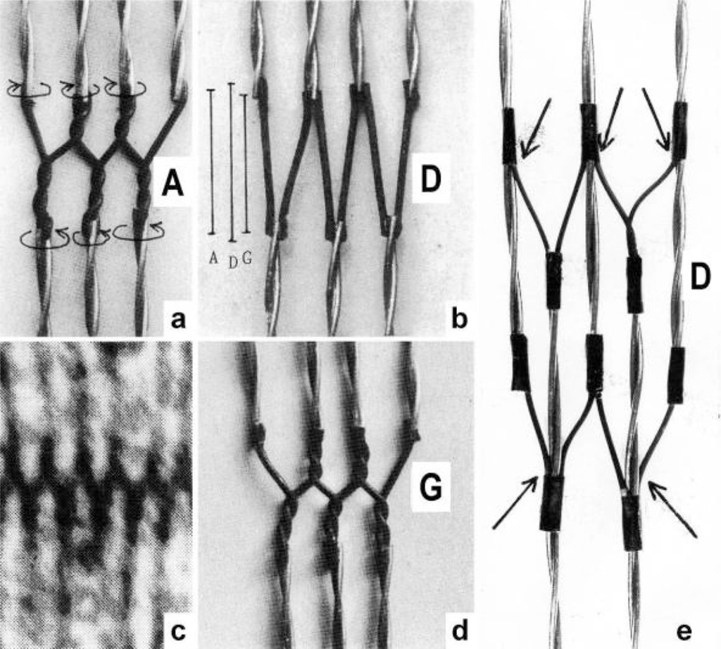To comprehend more exactly the amount of the produced tensile stress under different stretch conditions a drill-borer with the rubber Z-filaments was fixed on a digital balance (Figure 6). The drill-borer handle with the nut-coil was shifted down 12 cm in steps of 0.5 cm, guided by a wooden rail. The amount of pull (g) after each step was read off from the balance display. As shown by curve 1 in Figure 6d a single rubber Z-filament (Figure 6c) produces little pull (max. 80 g) when it is twisted by the drill-borer. Four Z-filaments in a distance of 7 mm (Figure 6b) produce much more pull (max. 400 g in stage G) during untwisting and twisting the Z-filaments (curve 2 in Figure 6d). The same Z-filaments in a distance of 30 mm (Figure 6a) produced most pull (about 700g in stage G) as shown by curve 3 in Figure 6d. The curves are not smooth because rubber has long-lasting after effects. The strong fall of the curves 3 and 2 after the peaks from stage G to D may depend on lengthening (unwinding) the distance W shown on the models of Figs. 5D and 10a. As demonstrated by Figure 6a and b an important factor for the production of strong tensile stress during untwisting and twisting is a large distance between the Z-filaments. We found in chapter 3.1 that the helical structure of the thin filaments transforms the tensile stress of stretch into counter clockwise rotation of the thin filaments. This rotation is now back-transformed in the Z-band and supports and accumulates tensile stress by an ingenious trick: The counter clockwise thin filament rotation is used for unwinding the four distant Z-filaments in order to generate the strong isometric force.