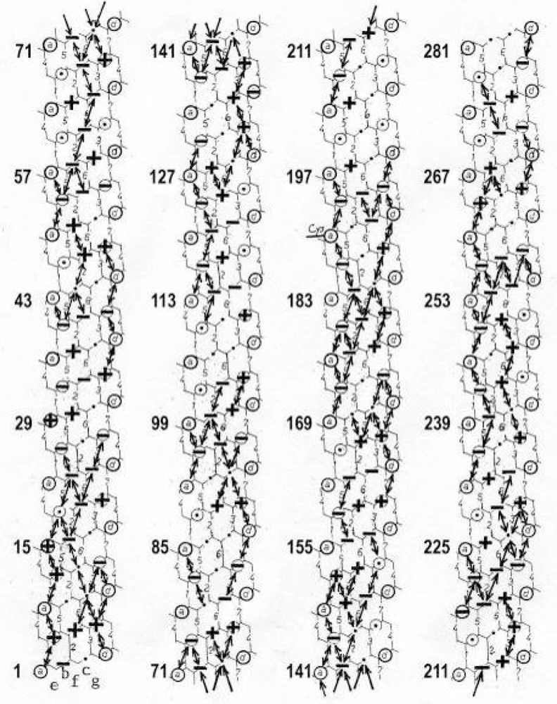Tropomyosin is one of the most charged proteins. There are 284 amino acids []. 136 are strongly charged, 81 are negative and 55 are positive. They are arranged mainly on the outer, convex side of the α-helix. Nearly all of the 82 side-chains arranged at the inner concave side of the α-helix are hydrophobic, connecting the two helices strongly together by hydrophobic side-chain interlocking (“knops into holes” according to Crick [,]). “The biological significance of the coiled-coil is evident: this structure confers rigidity to highly charged polypeptide chains in an aqueous environment. In contrast single chain synthetic copolymers of lysin and glutamic acid have little α-helix under condition of neutral pH, where the two-stranded coiled-coil is stable []” (quoted from []). However the question arises, to what purpose is the surface of the tropomyosin coiled-coil so strongly charged? According to Pauling and Corey [], and Corey and Pauling [], the interaction of side-chains can influence the length of the α-helical H-bonds. Also Bailey [] contemplating electrostatic contraction theories noticed that any modification of the electrostatic side chain forces must work in relation to the H-bonding of the α-helix, and Morales [] still emphasing the importance of the ion-polyelectrolyte effect, said: “Nothing...has weakened my intuitive conviction that the tension-generating device in excited muscle will prove to be a mechanically continuous structure... nor am I ready to relinquish my faith in Coulombic interactions as the most rapidly generated and the most long-ranges of the forces that the transducer could employ” (quoted from [, p. 181]). Thus it seems [,] that equally charged side chains arranged in axial direction repel each other and stretch so the axially directed α-helical H-bonds, which are arranged below the side chains on the outer surface of the coiled-coil. The H-bonds are numbered l to 7 in Figure 8 that shows one α-helix rolled down on a plain. The shorter H-bonds l, 4 and 7 near the coiled-coil axis, are protected because of the strong hydrophobic interactions between the side-chains on the positions a and d. This behaviour has the effect that the tropomyosin coiled-coil can change its pitch and conformation (see Figure 9c, d) without changing its axial length [].