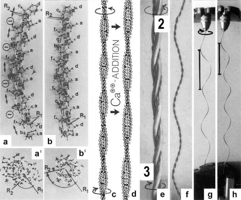 A reviewer suggested that I should explain why I did not perform biological experiments on muscle: I started my investigations in plant physiology with my doctor work on cytoplasmic streaming []. At the same time (1954) when the classic papers on filament sliding in muscle were published [,] I discovered motile fibrils in living cytoplasmic droplets squeezed out of characean internodal cells and observed them with optimal darkfield [, –]. Very fine fibrils visible by adhering particles moved quickly by repelling the immediate vicinity backwards into the opposite direction. The fibrils formed quickly rotating loops which wound up into ring bundles. The ring bundles inclined to become polygons with 4, 5, 6 or more angles. The crucial phenomenon was a regular wave-like motion of the angles and of the whole polygonal shape along the fibrillar ring bundle with its installed motionless particles. This wave-like motion was at first a mystery. But it could be explained, since the double-helical structure of actin filaments was revealed by electron microscopy [], and because the idle rotation of a helix shows the helical turns always in a wave-like motion. When actin filaments are mutually wound up and unwound a wave-like motion of the angles must result that could be simulated by helical spring models [, , ].