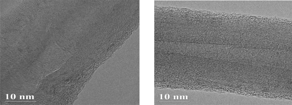 HRTEM observations of cmCs1/MWNTs (Left) and cmCs2/MWNTs (Right).