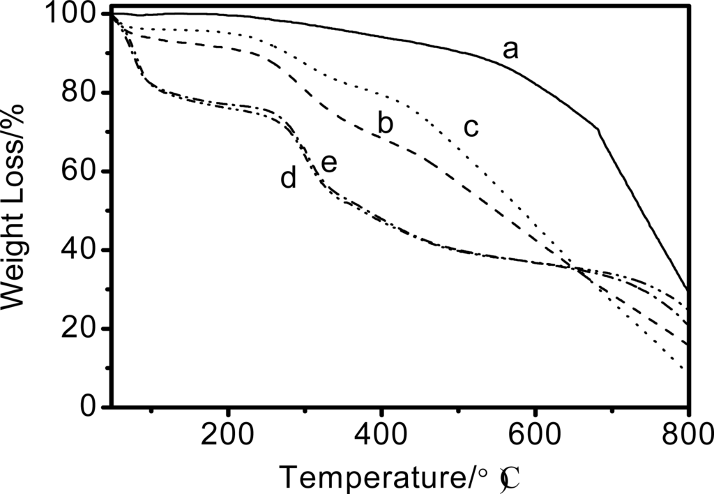 Due to the weight loss step of surface wrapped chitosan chain in TGA is overlap with the loss of carbon nanotubes, we used the first step of the loss of complexed water in the chitosan crystal to calculate the percentages of wrapped chitosan in the composites. As to do this, a first premise is that the chitosan chains have identified affinity to water molecules either in the absence or the presence of carbon nanotube. Therefore, one can deduce the percentages of chitosan of the cmCs/MWNTs composites by following equation: P=Ls/L0. Where P is the percentages of the chitosan in cmCs/MWNTs composites; Ls is the first loss percent < 120 °C in TGA curves of cmCs/MWNTs composites; L0 is the first loss percent < 120 °C in TGA curves of cmCs alone.