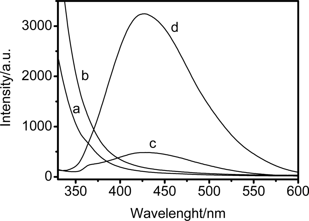 Fluorescence spectra of (a) cmCs1/MWNTs, (b) cmCs2/MWNTs, (c) cmCs1 and (d) cmCs2 after 320 nm excitation. All samples were adjusted to have the same absorption at 320 nm.