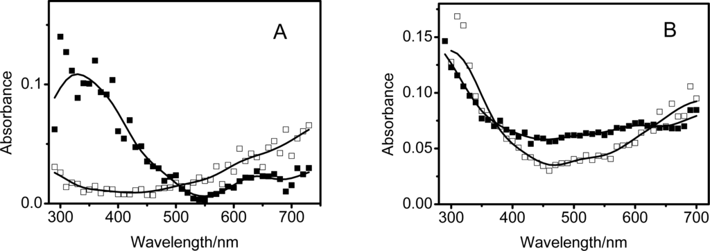 Transient absorption spectra recorded at 100 ns after 266 nm laser excitation for (A) cmCs1·+aq (□) and cmCs1·+/MWNTs (▪) and (B) cmCs2·+aq (□) and cmCs2·+/MWNTs (▪). All samples were adjusted to have the same absorption at 266 nm. The solid lines are computer fitting curves.