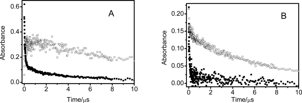 Decay profiles at 320 nm for (A) cmCs1·+aq (□) and cmCs1·+/MWNTs (▪) and (B) cmCs2·+aq (□) and cmCs2·+/MWNTs (▪). All samples were adjusted to have the same absorption at 266 nm.
