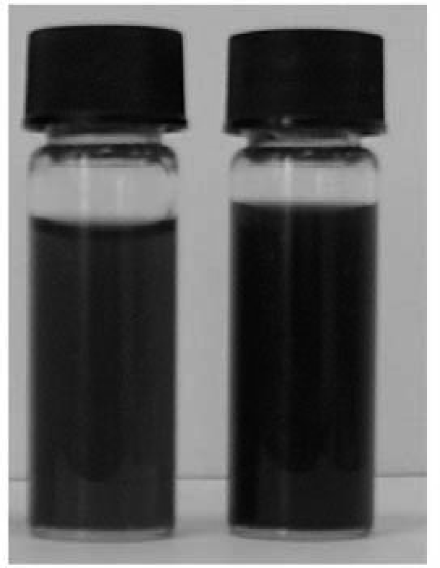 Photograph of aqueous solution of cmCs1/MWNTs (left) and cmCs2/MWNTs (right). The solutions were obtained by direct dispersion of the obtained cmCs1/MWNTs and cmCs2/MWNTs in water with vigorous shaking and then stored for a week.