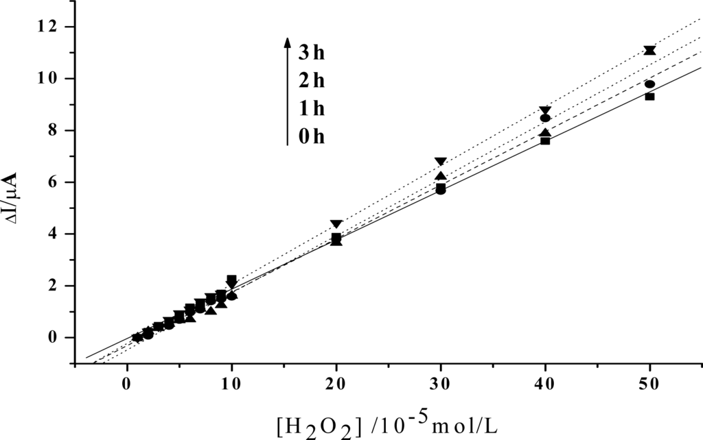 Linear relationship between the increase of the reduction peak current and H2O2 concentration after visible light irradiation of 0h, 1h, 2h, 3h, respectively (The value of the reduction peak with 10−5 mol/L H2O2 is set as 0). Others same as in Figure 2.
