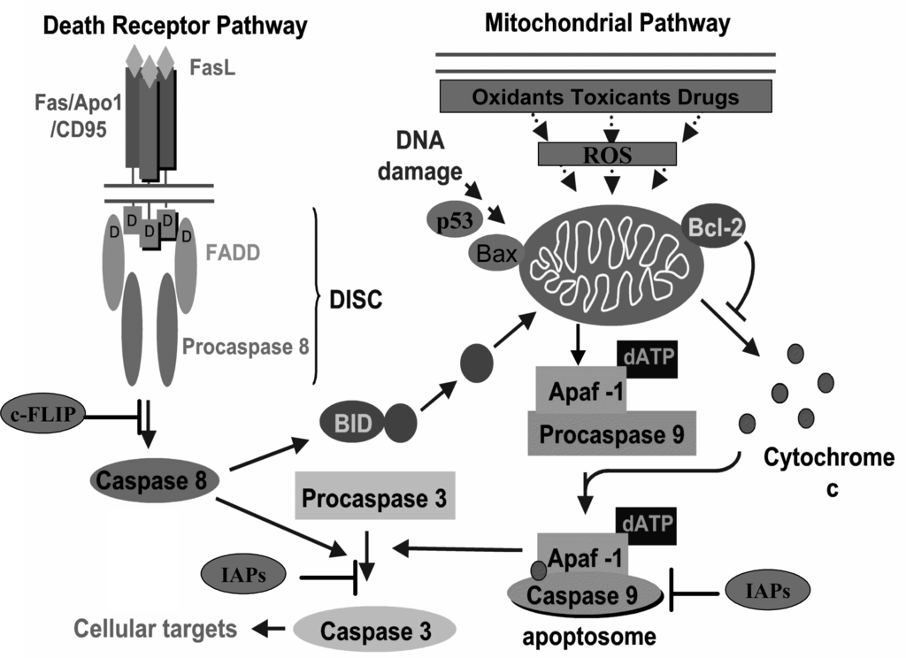 Apoptosis pathways: The extrinsic or death receptor pathway (left) is triggered by members of the death receptor superfamily such as Fas. Binding of Fas-L to Fas induces trimerization of the receptor, recruitment of specific adaptor proteins (FADD) and consequently recruitment of procaspase 8 molecules. The multi-molecular complex (DISC) results in the activation of caspase-8, which can be blocked by c-FLIP. Active caspase-8 can in turn activate Bid, a pro-apoptotic member of Bcl-2 family proteins, which represents a crosstalk between extrinsic and intrinsic pathways. Oxidants, toxicants, drugs or ionizing radiation, which all induce ROS overproduction and the stress signalling, can activate the intrinsic pathway (right). The intrinsic or mitochondrial pathway is also triggered by DNA damage via p53 activities. The death stimuli result in loss of mitochondrial membrane integrity and release of cythocrome c, Apaf-1 and other pro-apoptotic factors in the cytoplasm. Maintenance or perturbation of mitochondrial membrane potential depends on the ratio between pro-apoptotic (Bax) and anti-apoptotic (Bcl-2) members of Bcl-2 family, by causing or preventing cythocrome c release. Multiple molecules of cythocrome c, Apaf-1, dATP and procaspase-9 associate to form a supramolecular complex termed ‘apoptosome’, that activates caspase-9 through autocatalysis. Both the activated caspase-9 and caspase-8 cleave procaspase-3 generating the active caspase-3 that, in turn, activates other executor caspases and cleaves cellular targets. Caspase activity is controlled by Inhibitors of Apoptosis Protein (IAPs) family.