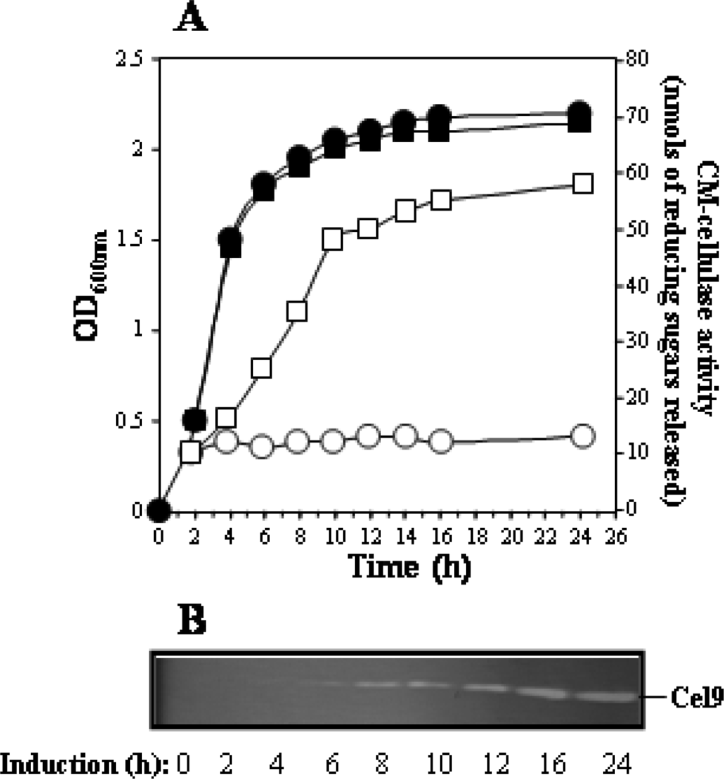 - Avitia, CI; Castellanos-Juárez, FX; Sánchez, E; Téllez-Valencia, A; Fajardo-Cavazos, P; Nicholson, W; Pedraza-Reyes, M. Temporal secretion of a multi-cellulolytic system in Myxobacter Sp. AL-1: Molecular cloning and heterologous expression of cel9 encoding a modular endocellulase clustered in an operon with cel48, an exocellobiohydrolase gene. Eur. J. Biochem. 2000, 267, 7058–7064. [Google Scholar]