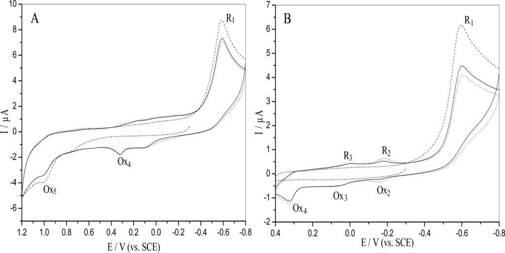 The reduction of nitrobenzenes is a complex process, especially for those compunds bearing hydroxyl or amine groups in the ortho- or para- positions []. The electrochemical behavior of o-nitrophenol on GCE was explored with cyclic voltammetry. Figure 1 showed the cyclic voltammograms of 5.0×10−5 M o-nitrophenol in 0.10 M pH 4.5 acetate buffer under different electrochemical conditions. Figure 1A was obtained with cycling between − 0.80 V and + 1.20 V, initial potential − 0.30V. A very large irreversible cathodic peak (R1) and an irreversible anodic peak (Ox5) appeared at around Epc = − 0.602 V and Epa = + 0.998 V in the first cycle, respectively. The R1 peak corresponded to a four electrons / four protons reaction, forming hydroxylamine [, ], typical of a nitro reduction in acidic aqueous solution, and decreased in subsequent cycles. Peak Ox5 at Epa= + 0.998 V, was related to the irreversible oxidation of the phenolic group and also decreased in following cycles due to the phenol polymerization at the electrode surface []. It was interesting to observe another irreversible anodic peak (Ox4) at Epa = + 0.335 V in the second and third cycle, which probably corresponded to condensation reactions expected concerning the oxidation of the reduced intermediates formed, generating electroactive azoxy derivatives [, , ].