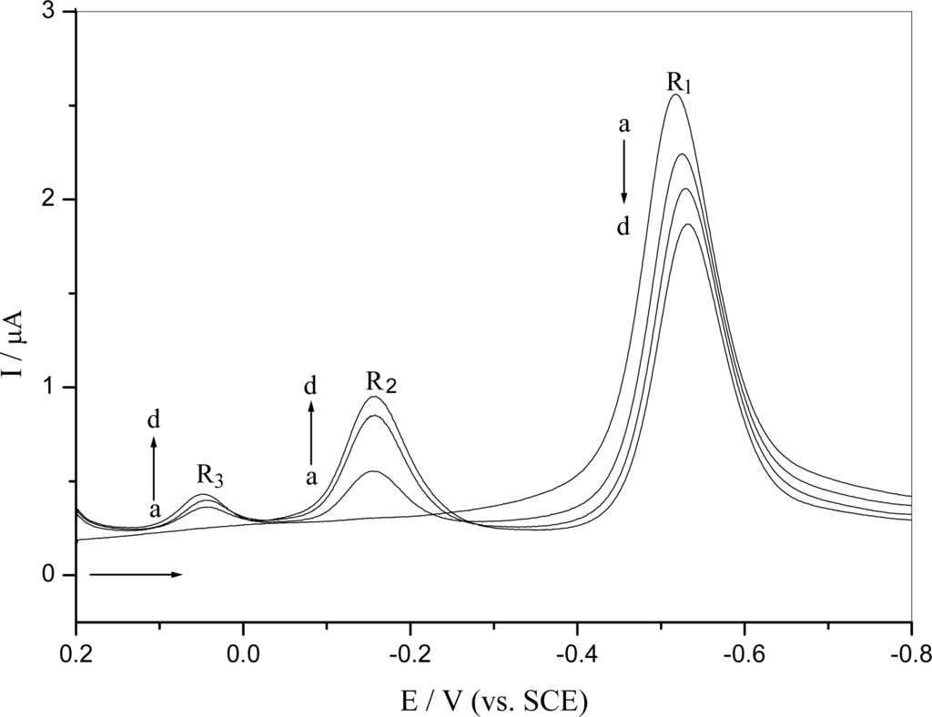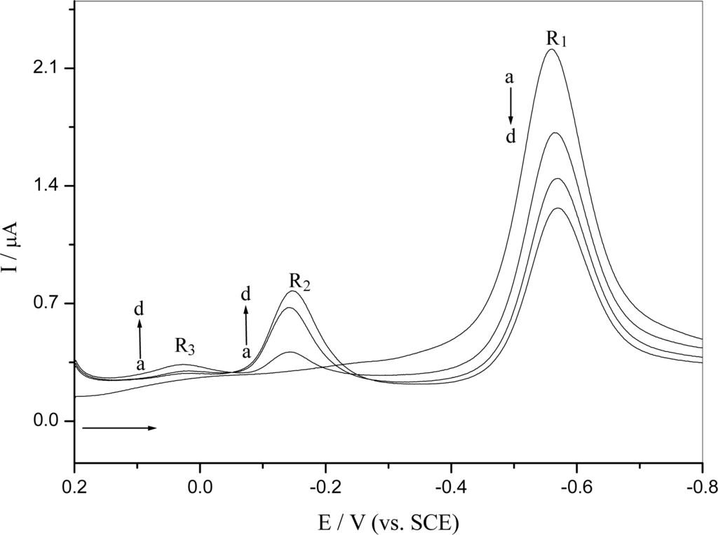 Repetitive differential pulse voltammograms for reduction of o-nitrophenol is shown in Figure 2. The R2 and R3 wave only appeared in the second and following cycles after the initial o-nitrophenol reduction, which was the same with what observed in the cyclic voltammogram. The reduction peak R1 corresponding to the nitro group was decreased, while the reduction peak corresponding to the nitroso derivative R2 and azoxy derivative R3 were increased in subsequent scans. This behavior could be explained by reduction of o-nitrophenol leading to its consumption on the electrode surface and electrogenerating a hydroxylamine derivative that adsorbed onto the electrode surface and was oxidized to nitroso and other derivatives.