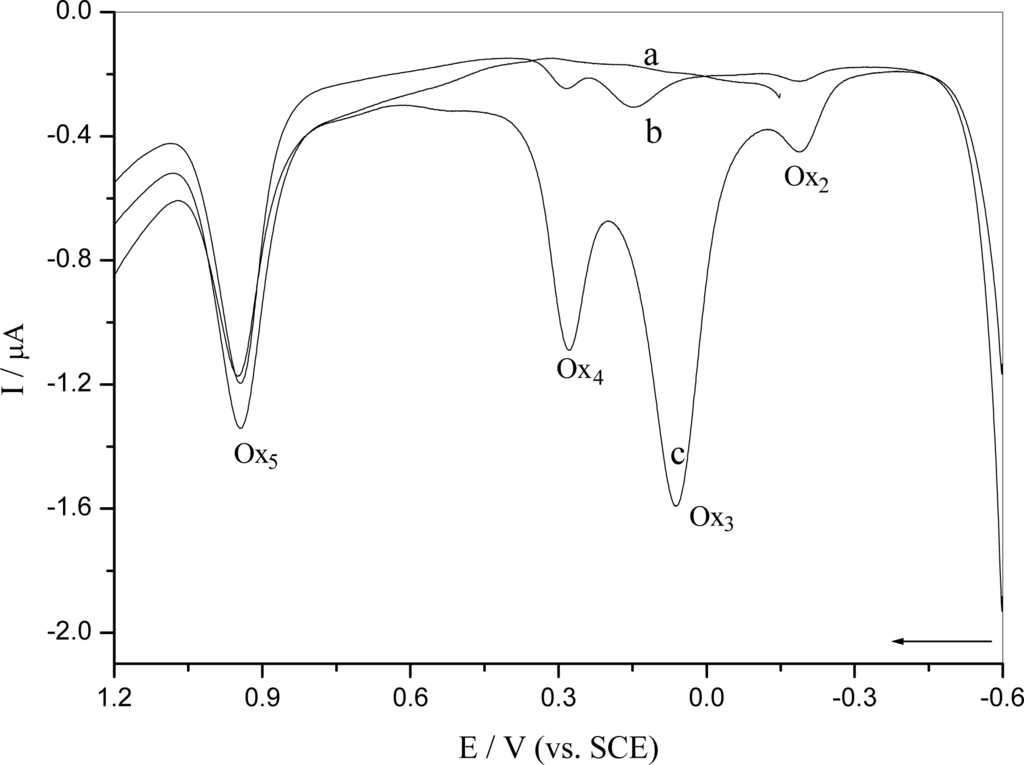 Figure 3 shows the differential pulse voltammogram for oxidation of o-nitrophenol starting at different potentials and deposition at a constant potential. It was confirmed that peak Ox5 was due to the irreversible oxidation of the phenolic group, as only this group is able to undergo oxidation in o-nitrophenol (Figure 3, curve a), and that Ox2, Ox3 and Ox4 were generated only after o-nitrophenol was reduced at − 0.60 V (Figure 3, curve b and c). It caused an increase in the peak Ox2, Ox3 and Ox4 after applying a potential of − 0.6 V for 2 minters (Figure 3, curve c), which produced abundant hydroxylamine in this process.